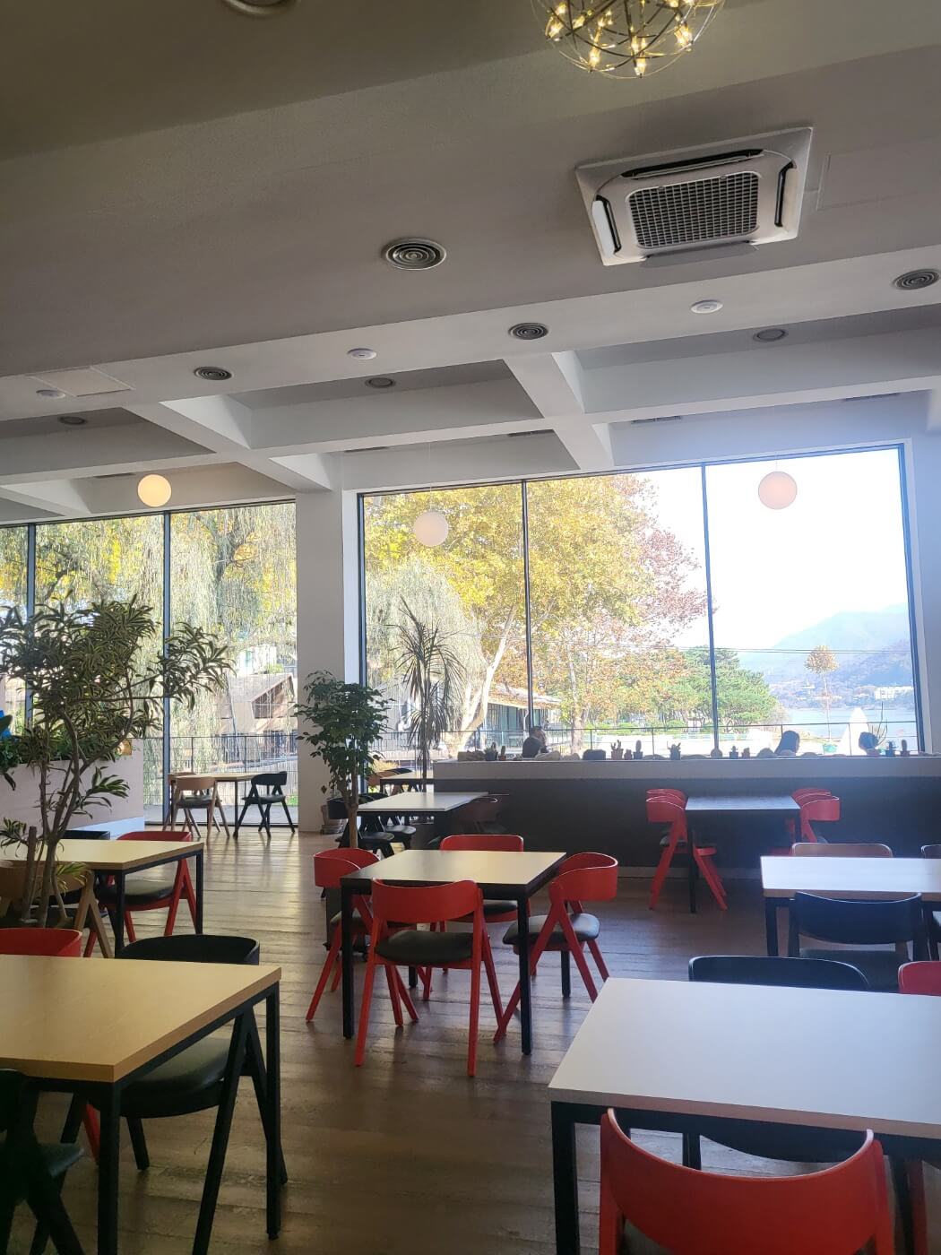 리버나인의 가장 큰 매력 포인트는 전면 통창 너머로 펼쳐지는 북한강 뷰입니다. 강 바로 앞까지 연결된 공간과 탁 트인 숲 풍경, 햇살이 비치는 오후에는 시간마저 천천히 흐르는 기분이 들어요. 말로는 부족한 모습 정말 고즈넉하니 여유롭고 테이블 간격도 넣어 아주 좋습니다. 조용히 이야기 나누며 차와 브런치 하기에 딱 좋고요~