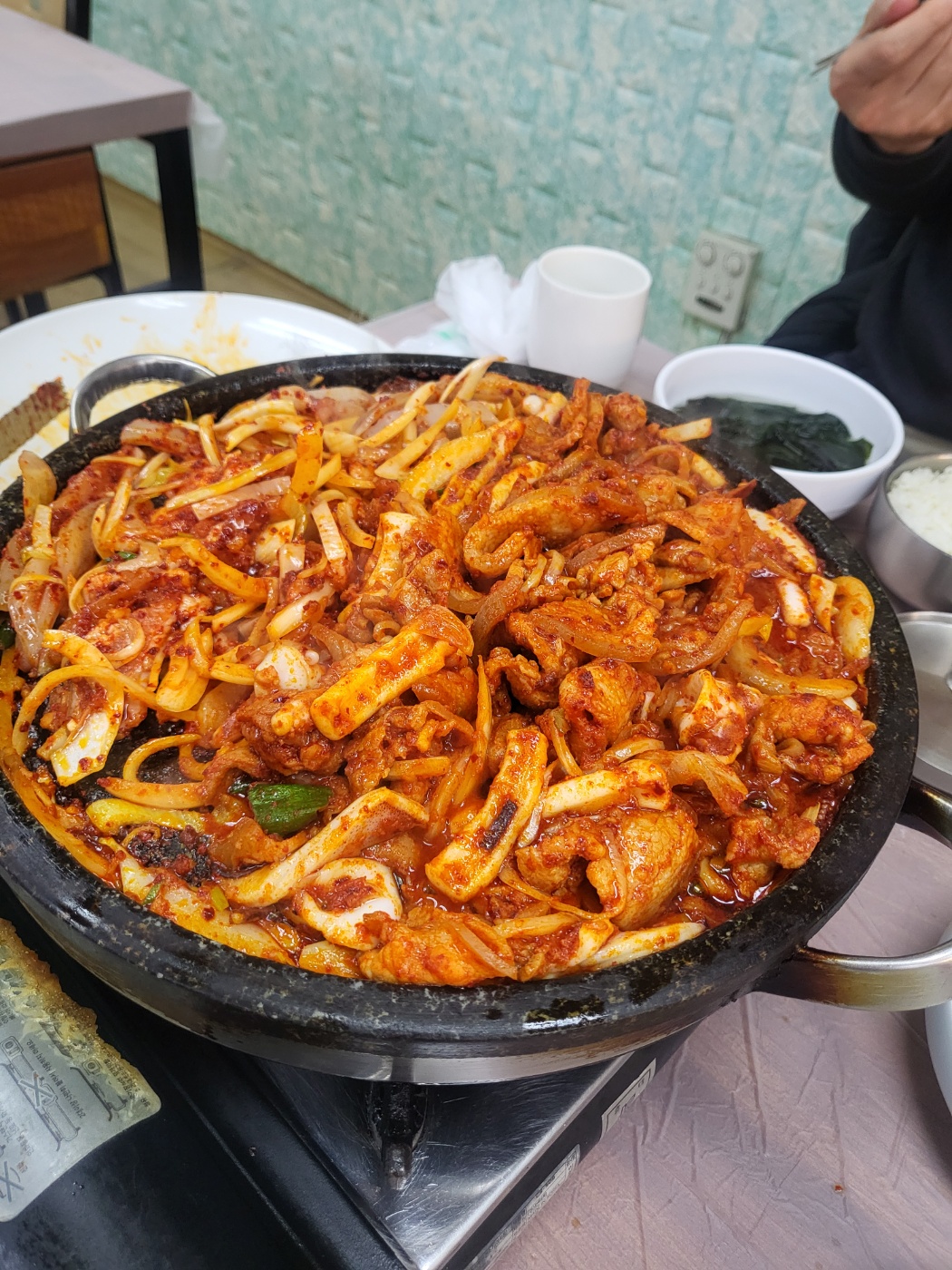 삼겹살은 지나치게 두껍지 않아 오징어와 식감이 잘 어울렸고, 오징어 역시 질기지 않고 적당히 부드러웠습니다. 양념은 과하지 않으면서도 계속 손이 가는 스타일이라 밥과 함께 먹기 딱 좋았습니다. 짜거나 맵지않아서 식사후에도 지나치게 물을 들이키지 않을수 있고 또 같이 볶아주시는 양파가 정말 맛있어요!!!!